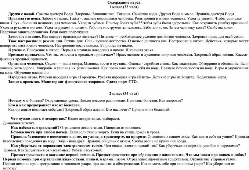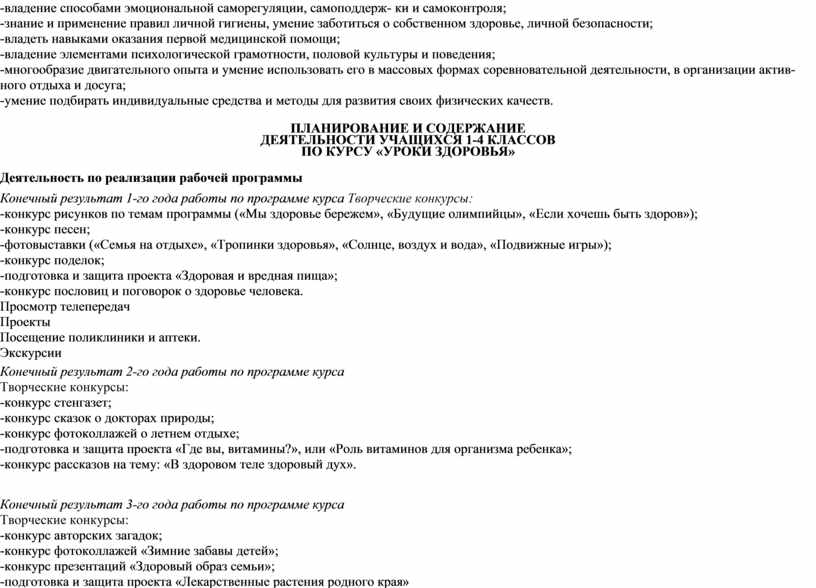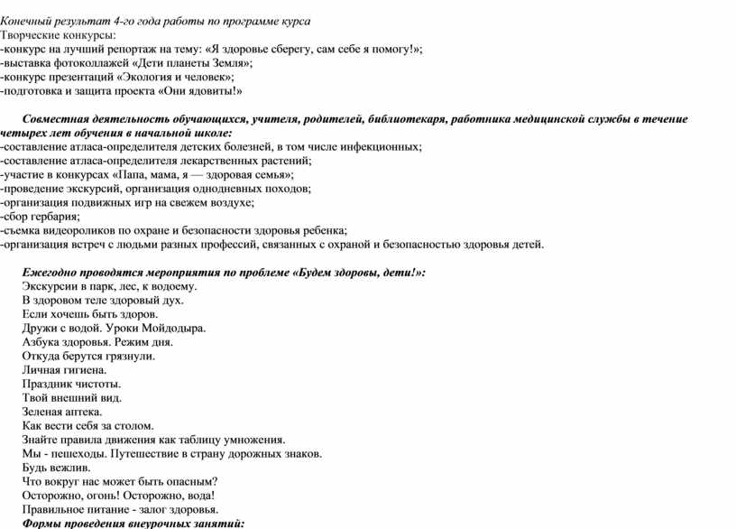 Программа охватывает основные направления здоровьесберегающей деятельности в начальной школе и позволяет пробуждать в детях желания заботиться о своем здоровье, относиться к своему здоровью как к ценности; формировать установки на использование здорового питания; издавать оптимальные двигательные режимы для детей с учетом из возрастных, психологических и иных особенностей, развивать потребности I занятиях физической культурой и спортом; соблюдать рекомендуемый врачами режим дня; снизить влияния негативных факторов и рисков на здоровье детей (низкая двигательная активность, курение, алкоголь, наркотики и другие психоактивные вещества, инфекционные заболевания);