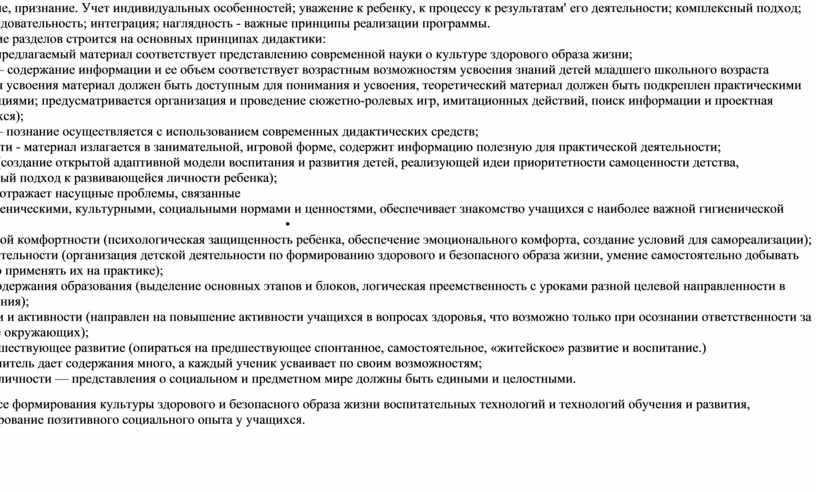 -принцип доступности — содержание информации и ее объем соответствует возрастным возможностям усвоения знаний детей младшего школьного возраста (предлагаемый детям для усвоения материал должен быть доступным для понимания и усвоения, теоретический материал должен быть подкреплен практическими действиями и демонстрациями; предусматривается организация и проведение сюжетно-ролевых игр, имитационных действий, поиск информации и проектная деятельность обучающихся);