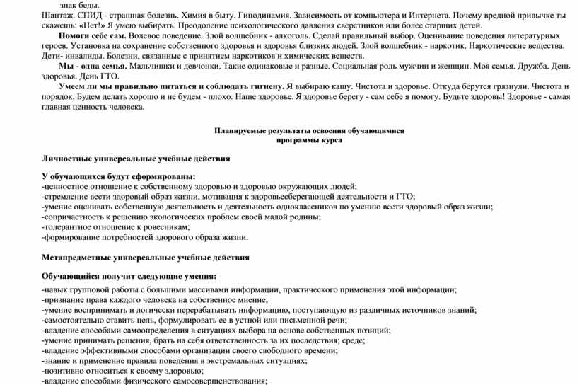 со здоровьем детей, гигиеническими, культурными, социальными нормами и ценностями, обеспечивает знакомство учащихся с наиболее важной гигиенической информацией); •