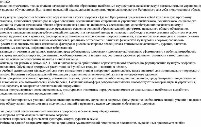 Программа формирования культуры здорового и безопасного образа жизни «Уроки здоровья » (далее Программа) представляет собой комплексную программу формирования знаний, установок, личностных ориентиров и норм поведения, обеспечивающих сохранение и укрепление физического, психического, социального здоровья младших школьников за ступени начального общего образования как одной из ценностных составляющих. способствующих познавательному и эмоциональному развитию ребенка, достижению планируемых результатов освоения основной образовательной программы начального общего образования.