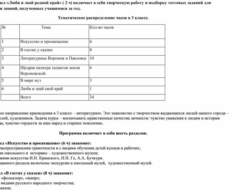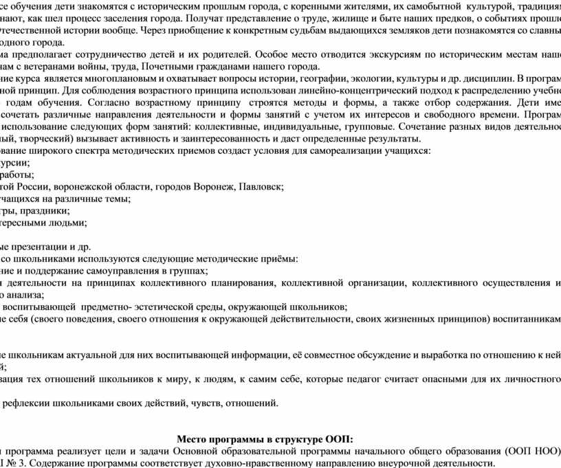 Содержание курса является многоплановым и охватывает вопросы истории, географии, экологии, культуры и др. дисциплин. В программе учтён возрастной принцип. Для соблюдения возрастного принципа использован линейно-концентрический подход к распределению учебного материала по годам обучения. Согласно возрастному принципу строятся методы и формы, а также отбор содержания. Дети имеют возможность сочетать различные направления деятельности и формы занятий с учетом их интересов и свободного времени. Программа предполагает использование следующих форм занятий: коллективные, индивидуальные, групповые. Сочетание разных видов деятельности (познавательный, творческий) вызывает активность и заинтересованность и даст определенные результаты.