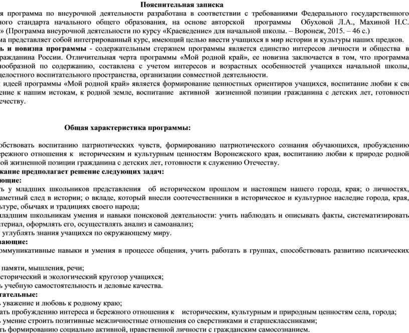Рабочая программа по внеурочной деятельности разработана в соответствии с требованиями Федерального государственного образовательного стандарта начального общего образования, на основе авторской программы Обуховой Л.А., Махиной Н.С. «Краеведение» (Программа внеурочной деятельности по курсу «Краеведение» для начальной школы. – Воронеж, 2015. – 46 с.)
