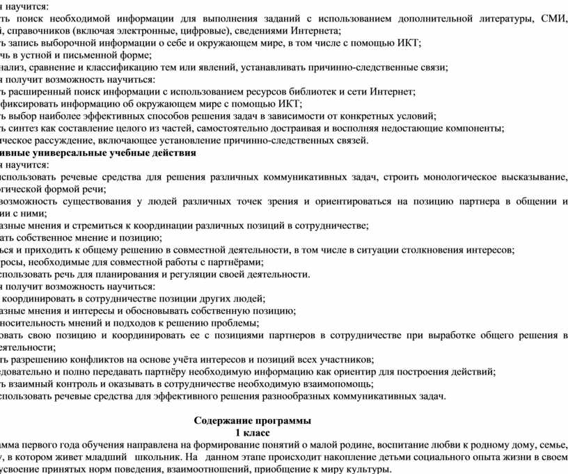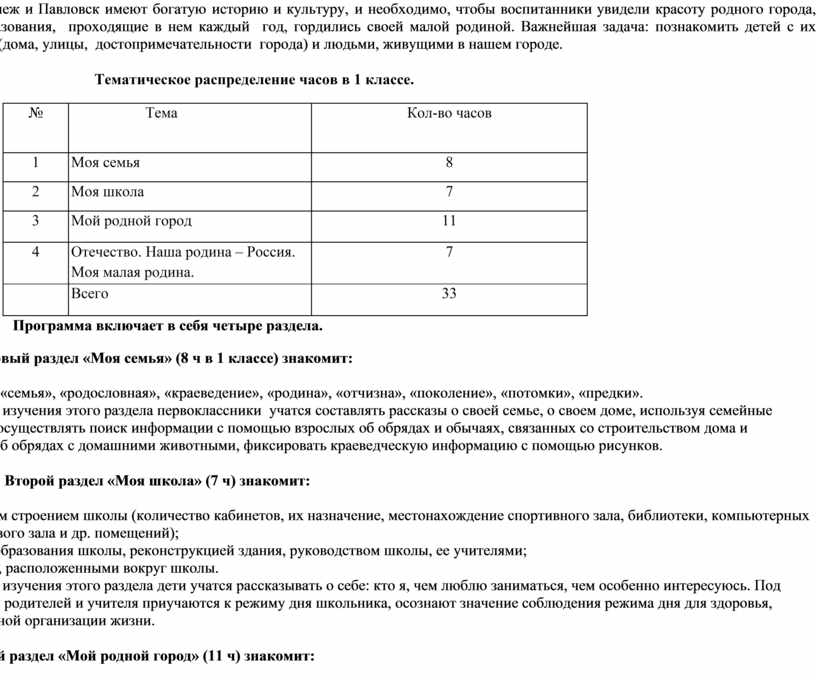 Программа 1 класса направлена на формирование обществоведческих (социальных) представлений младших школьников. Особое внимание уделяется миру семьи. Дети осознают ценности семьи, особенности взаимоотношений в семье между родственниками, учатся понимать важность семейных традиций и праздников. В лексикон учащихся вводятся слова поколение, потомки, предки. Особое внимание уделяется составу семейного коллектива. Дети знакомятся с окружающим их социальным миром и с жизнью людей, встречаются с очевидцами исторических событий, представителями музеев, библиотек и других предприятий. Также школьники приобретают знания о принятых в обществе нормах отношения к природе, о памятниках истории и культуры, о традициях памяти событий Великой Отечественной войны; о правилах конструктивной групповой работы; о способах самостоятельного поиска и нахождения информации в справочной литературе.