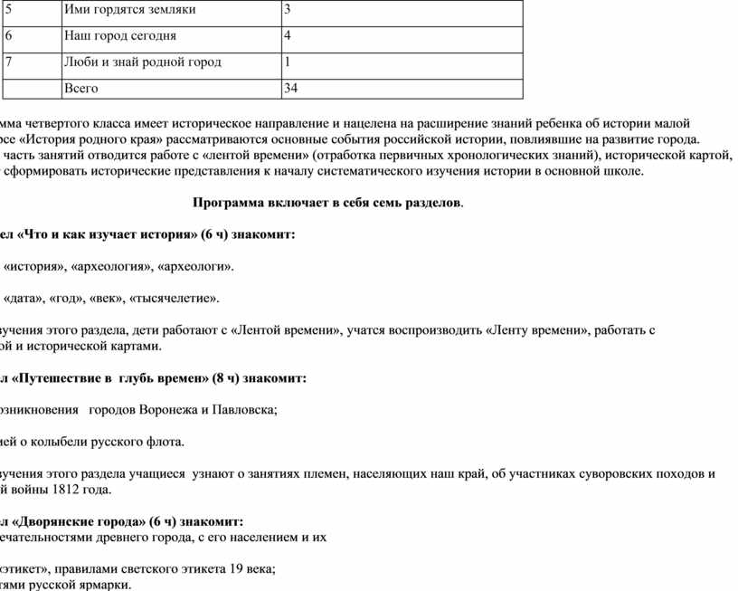 В процессе обучения дети знакомятся с историческим прошлым города, с коренными жителями, их самобытной культурой, традициями, обычаями. Узнают, как шел процесс заселения города. Получат представление о труде, жилище и быте наших предков, о событиях прошлого и их месте в Отечественной истории вообще. Через приобщение к конкретным судьбам выдающихся земляков дети познакомятся со славными страницами родного города.