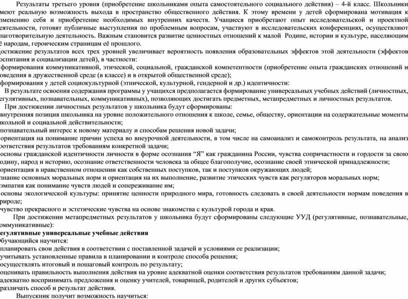 Результаты третьего уровня (приобретение школьниками опыта самостоятельного социального действия) – 4-й класс. Школьники имеют реальную возможность выхода в пространство общественного действия. К этому времени у детей сформирована мотивация к изменению себя и приобретение необходимых внутренних качеств. Учащиеся приобретают опыт исследовательской и проектной деятельности, готовят публичные выступления по проблемным вопросам, участвуют в исследовательских конференциях, осуществляют благотворительную деятельность. Важным становится развитие ценностных отношений к малой Родине, истории и культуре, населяющим её народам, героическим страницам её прошлого.