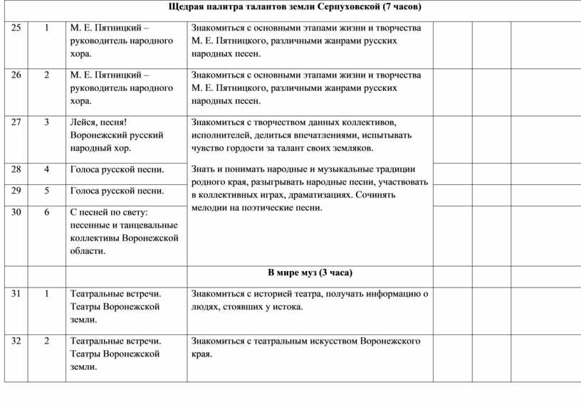 Знакомиться с основными этапами жизни и творчества М. Е. Пятницкого, различными жанрами русских народных песен. |