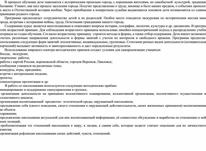 Содержание курса является многоплановым и охватывает вопросы истории, географии, экологии, культуры и др. дисциплин. В программе учтён возрастной принцип. Для соблюдения возрастного принципа использован линейно-концентрический подход к распределению учебного материала по годам обучения. Согласно возрастному принципу строятся методы и формы, а также отбор содержания. Дети имеют возможность сочетать различные направления деятельности и формы занятий с учетом их интересов и свободного времени. Программа предполагает использование следующих форм занятий: коллективные, индивидуальные, групповые. Сочетание разных видов деятельности (познавательный, творческий) вызывает активность и заинтересованность и даст определенные результаты.