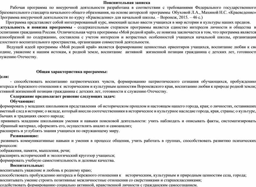 Рабочая программа по внеурочной деятельности разработана в соответствии с требованиями Федерального государственного образовательного стандарта начального общего образования, на основе авторской программы Обуховой Л.А., Махиной Н.С. «Краеведение» (Программа внеурочной деятельности по курсу «Краеведение» для начальной школы. – Воронеж, 2015. – 46 с.)