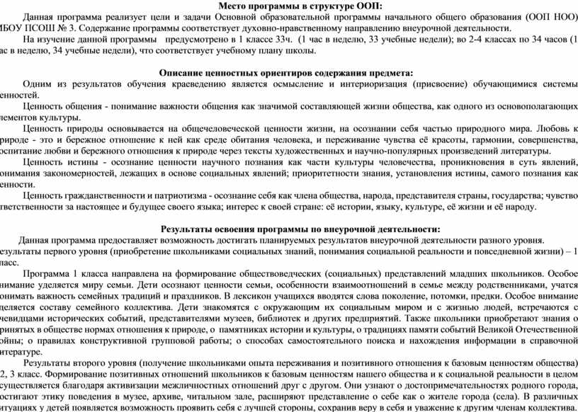 Данная программа реализует цели и задачи Основной образовательной программы начального общего образования (ООП НОО) МБОУ ПСОШ № 3. Содержание программы соответствует духовно-нравственному направлению внеурочной деятельности.