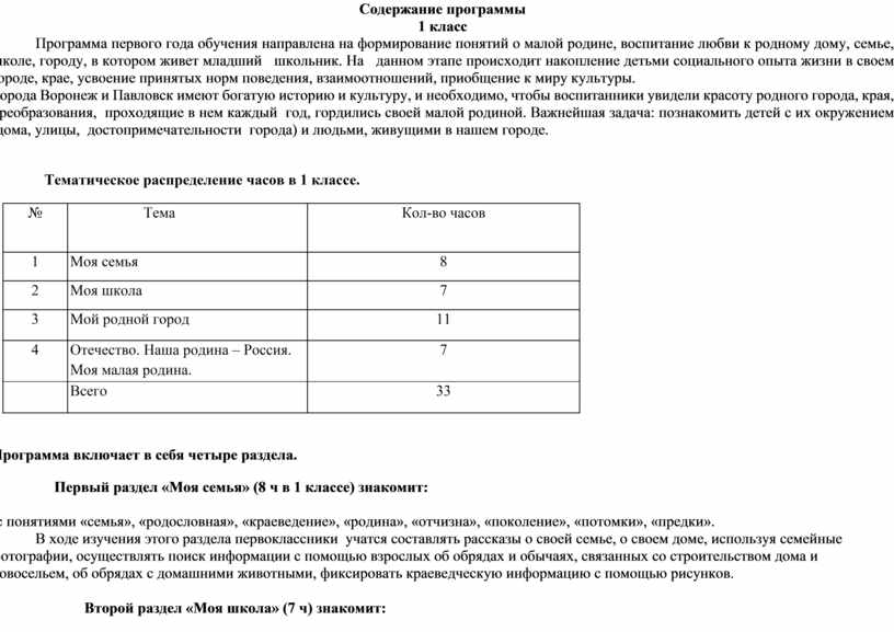 Программа 1 класса направлена на формирование обществоведческих (социальных) представлений младших школьников. Особое внимание уделяется миру семьи. Дети осознают ценности семьи, особенности взаимоотношений в семье между родственниками, учатся понимать важность семейных традиций и праздников. В лексикон учащихся вводятся слова поколение, потомки, предки. Особое внимание уделяется составу семейного коллектива. Дети знакомятся с окружающим их социальным миром и с жизнью людей, встречаются с очевидцами исторических событий, представителями музеев, библиотек и других предприятий. Также школьники приобретают знания о принятых в обществе нормах отношения к природе, о памятниках истории и культуры, о традициях памяти событий Великой Отечественной войны; о правилах конструктивной групповой работы; о способах самостоятельного поиска и нахождения информации в справочной литературе.
