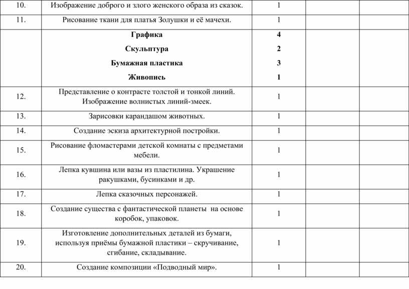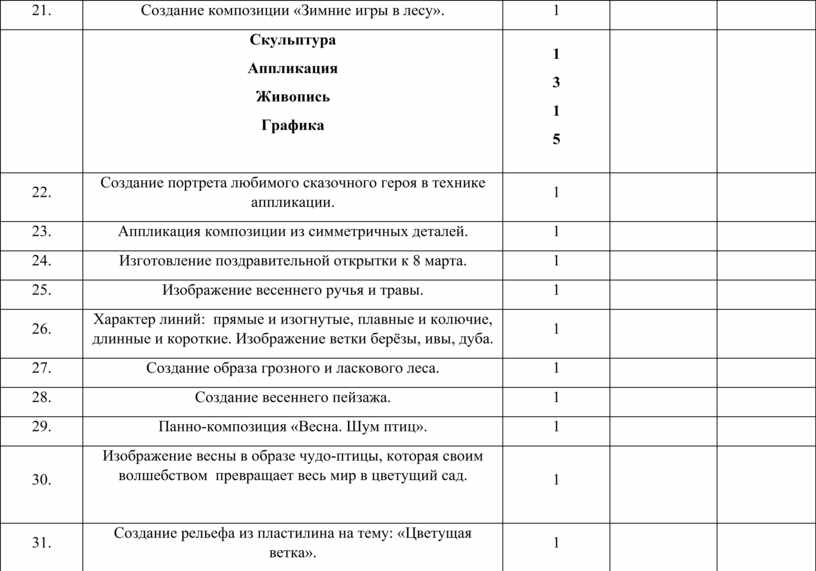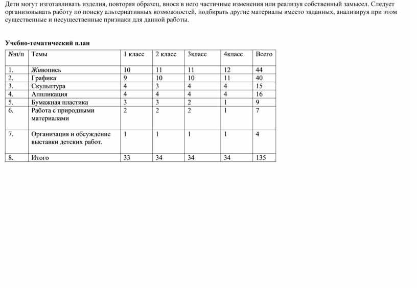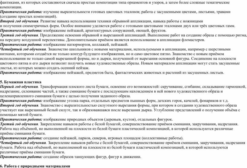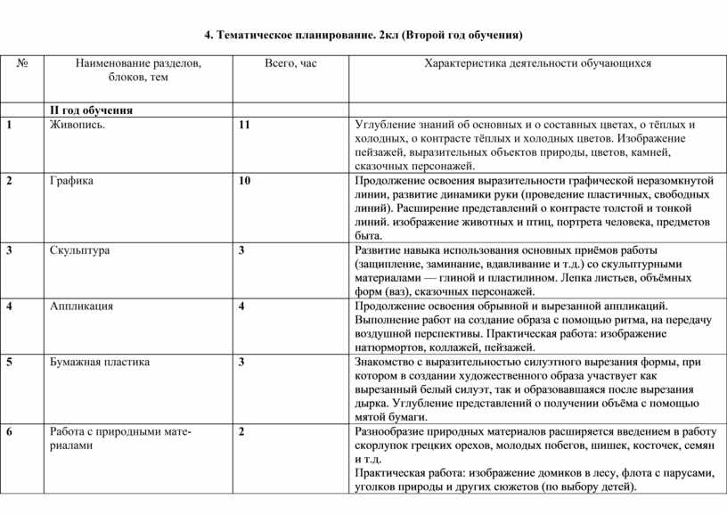 Задания направлены на освоение языка художественной выразительности станкового искусства (живопись, графика, скульптура), а также языка декоративно-прикладного искусства (аппликация, декоративные композиции из скульптурного материала) и бумажной пластики. Кроме этого, предполагается творческая работа с природными материалами.