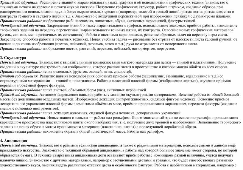 Четвёртый год обучения. Новые знания и навыки — работа над рельефом. Подготовительный этап по освоению рельефа: продавливание карандашом пространства пластилиновой плиты около изображения, т. е. получение двух уровней в изображении. Выполнение творческого задания на поиск образа в мятом куске мягкого материала (пластилина, глины) с последующей доработкой образа.