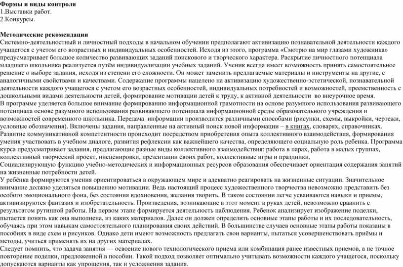Системно-деятельностный и личностный подходы в начальном обучении предполагают активизацию познавательной деятельности каждого учащегося с учетом его возрастных и индивидуальных особенностей. Исходя из этого, программа «Смотрю на мир глазами художника» предусматривает большое количество развивающих заданий поискового и творческого характера. Раскрытие личностного потенциала младшего школьника реализуется путём индивидуализации учебных заданий. Ученик всегда имеет возможность принять самостоятельное решение о выборе задания, исходя из степени его сложности. Он может заменить предлагаемые материалы и инструменты на другие, с аналогичными свойствами и качествами. Содержание программы нацелено на активизацию художественно-эстетической, познавательной деятельности каждого учащегося с учетом его возрастных особенностей, индивидуальных потребностей и возможностей, преемственность с дошкольными видами деятельности детей, формирование мотивации детей к труду, к активной деятельности во внеурочное время.