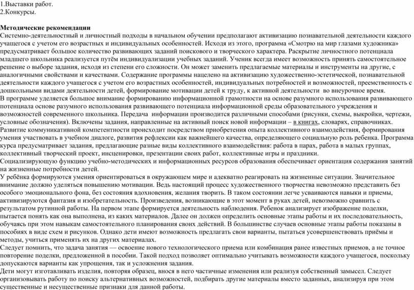 Системно-деятельностный и личностный подходы в начальном обучении предполагают активизацию познавательной деятельности каждого учащегося с учетом его возрастных и индивидуальных особенностей. Исходя из этого, программа «Смотрю на мир глазами художника» предусматривает большое количество развивающих заданий поискового и творческого характера. Раскрытие личностного потенциала младшего школьника реализуется путём индивидуализации учебных заданий. Ученик всегда имеет возможность принять самостоятельное решение о выборе задания, исходя из степени его сложности. Он может заменить предлагаемые материалы и инструменты на другие, с аналогичными свойствами и качествами. Содержание программы нацелено на активизацию художественно-эстетической, познавательной деятельности каждого учащегося с учетом его возрастных особенностей, индивидуальных потребностей и возможностей, преемственность с дошкольными видами деятельности детей, формирование мотивации детей к труду, к активной деятельности во внеурочное время.