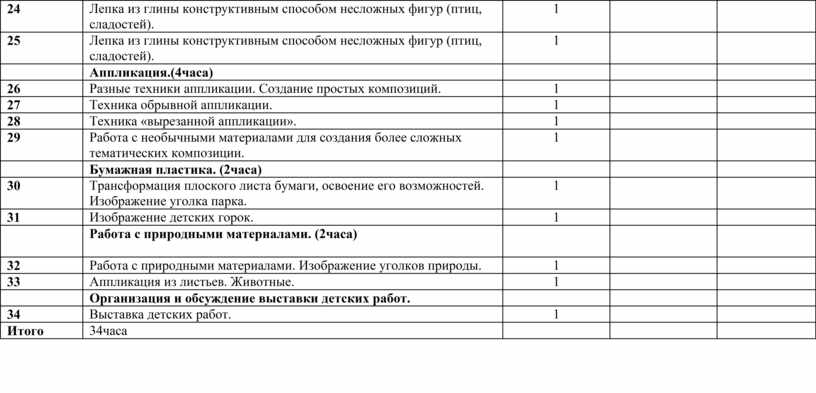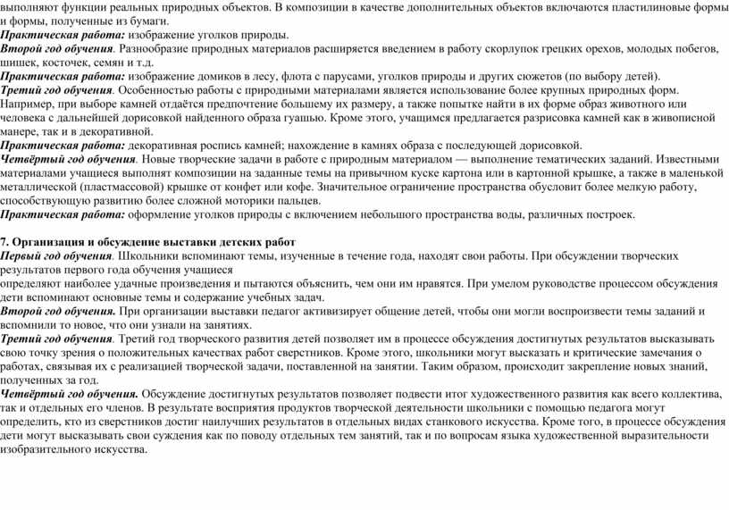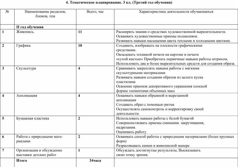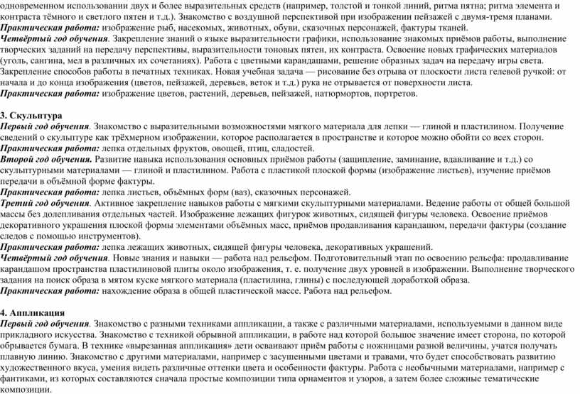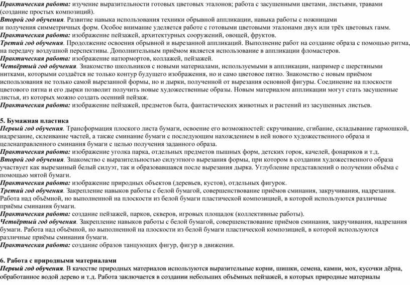 Задания направлены на освоение языка художественной выразительности станкового искусства (живопись, графика, скульптура), а также языка декоративно-прикладного искусства (аппликация, декоративные композиции из скульптурного материала) и бумажной пластики. Кроме этого, предполагается творческая работа с природными материалами.