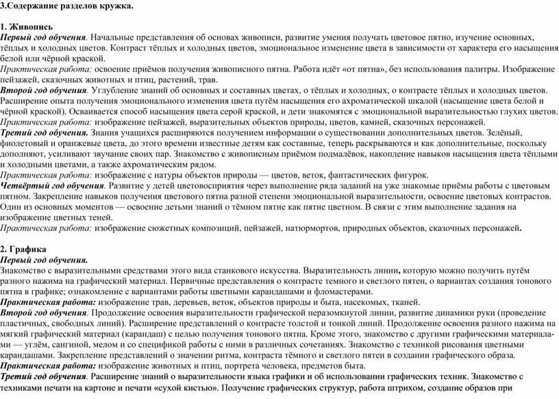 Первый год обучения. Начальные представления об основах живописи, развитие умения получать цветовое пятно, изучение основных, тёплых и холодных цветов. Контраст тёплых и холодных цветов, эмоциональное изменение цвета в зависимости от характера его насыщения белой или чёрной краской.