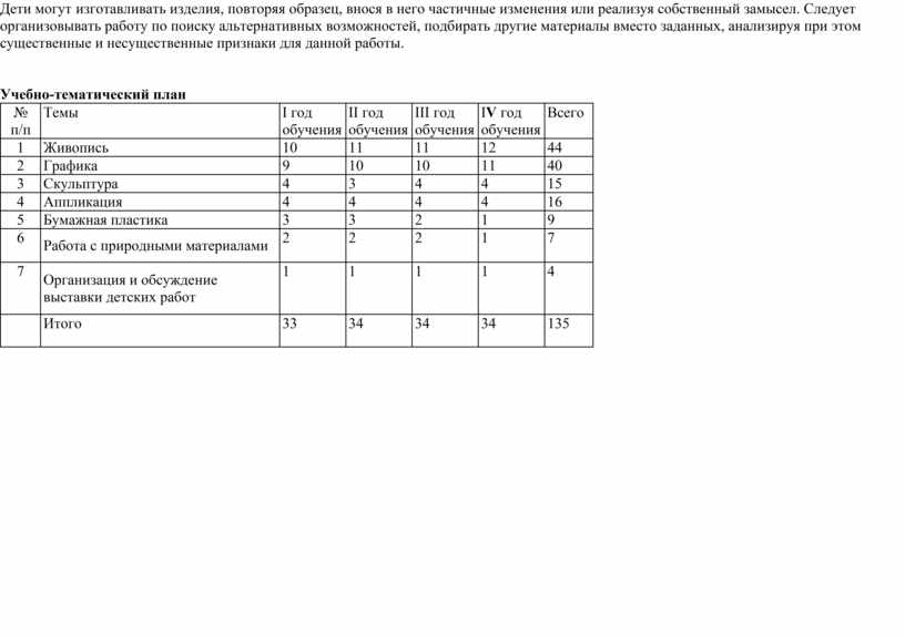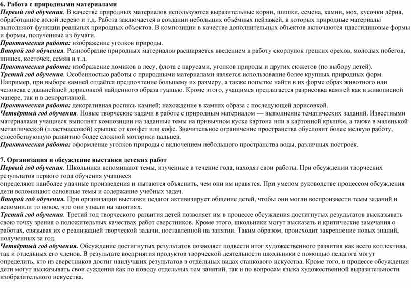 Четвёртый год обучения. Обсуждение достигнутых результатов позволяет подвести итог художественного развития как всего коллектива, так и отдельных его членов. В результате восприятия продуктов творческой деятельности школьники с помощью педагога могут определить, кто из сверстников достиг наилучших результатов в отдельных видах станкового искусства. Кроме того, в процессе обсуждения дети могут высказывать свои суждения как по поводу отдельных тем занятий, так и по вопросам языка художественной выразительности изобразительного искусства.