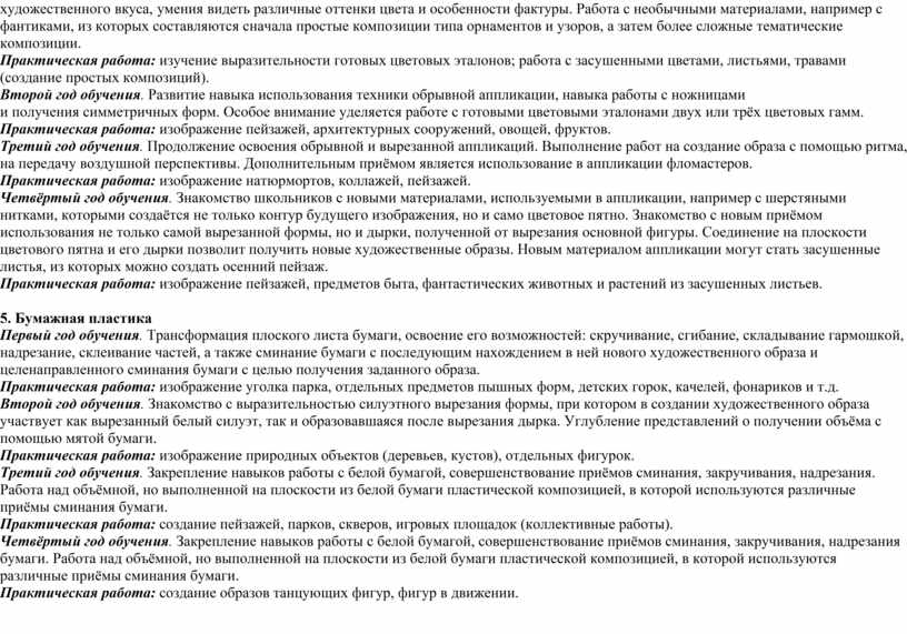 Первый год обучения. Трансформация плоского листа бумаги, освоение его возможностей: скручивание, сгибание, складывание гармошкой, надрезание, склеивание частей, а также сминание бумаги с последующим нахождением в ней нового художественного образа и целенаправленного сминания бумаги с целью получения заданного образа.