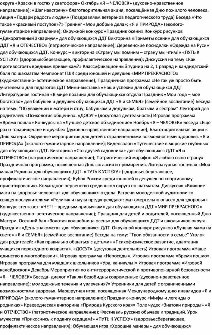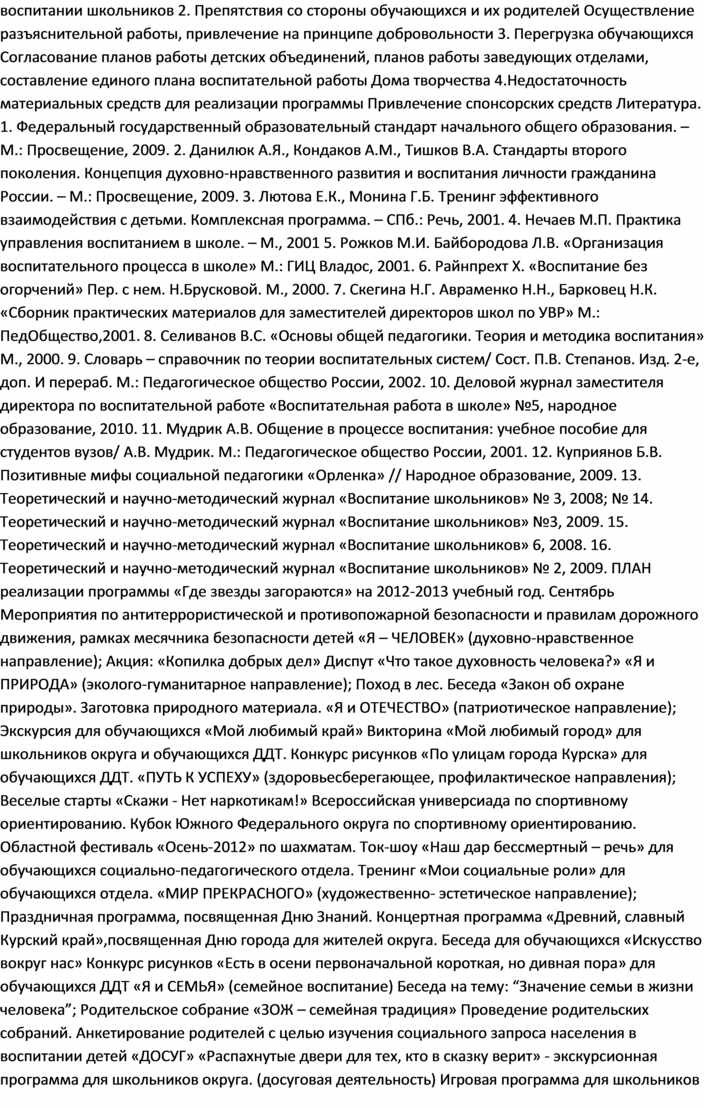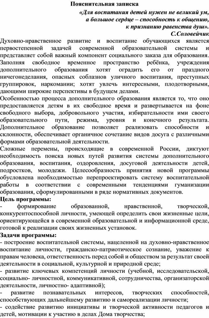 Духовно-нравственное развитие и воспитание обучающихся является первостепенной задачей современной образовательной системы и представляет собой важный компонент социального заказа для образования. Заполняя свободное временное пространство ребёнка, учреждения дополнительного образования хотят оградить его от праздного ничегонеделания, опасных соблазнов уличного воспитания, преступных группировок, наркомании; хотят увлечь интересными, плодотворными, дающими широкие перспективы в будущем делами.