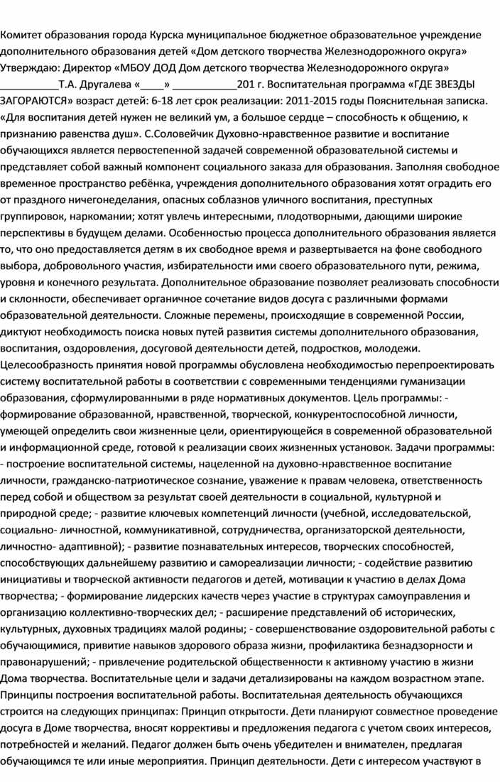 Комитет образования города Курска муниципальное бюджетное образовательное учреждение дополнительного образования детей «Дом детского творчества Железнодорожного округа» Утверждаю: Директор «МБОУ ДОД Дом детского творчества Железнодорожного округа» __________Т.А. Другалева «____» ___________201 г. Воспитательная программа «ГДЕ ЗВЕЗДЫ ЗАГОРАЮТСЯ» возраст детей: 6-18 лет срок реализации: 2011-2015 годы Пояснительная записка. «Для воспитания детей нужен не великий ум, а большое сердце – способность к общению, к признанию равенства душ». С.Соловейчик Духовно-нравственное развитие и воспитание обучающихся является первостепенной задачей современной образовательной системы и представляет собой важный компонент социального заказа для образования. Заполняя свободное временное пространство ребёнка, учреждения дополнительного образования хотят оградить его от праздного ничегонеделания, опасных соблазнов уличного воспитания, преступных группировок, наркомании; хотят увлечь интересными, плодотворными, дающими широкие перспективы в будущем делами. Особенностью процесса дополнительного образования является то, что оно предоставляется детям в их свободное время и развертывается на фоне свободного выбора, добровольного участия, избирательности ими своего образовательного пути, режима, уровня и конечного результата. Дополнительное образование позволяет реализовать способности и склонности, обеспечивает органичное сочетание видов досуга с различными формами образовательной деятельности. Сложные перемены, происходящие в современной России, диктуют необходимость поиска новых путей развития системы дополнительного образования, воспитания, оздоровления, досуговой деятельности детей, подростков, молодежи. Целесообразность принятия новой программы обусловлена необходимостью перепроектировать систему воспитательной работы в соответствии с современными тенденциями гуманизации образования, сформулированными в ряде нормативных документов. Цель программы: - формирование образованной, нравственной, творческой, конкурентоспособной личности, умеющей определить свои жизненные цели, ориентирующейся в современной образовательной и информационной среде, готовой к реализации своих жизненных установок. Задачи программы: - построение воспитательной системы, нацеленной на духовно-нравственное воспитание личности, гражданско-патриотическое сознание, уважение к правам человека, ответственность перед собой и обществом за результат своей деятельности в социальной, культурной и природной среде; - развитие ключевых компетенций личности (учебной, исследовательской, социально- личностной, коммуникативной, сотрудничества, организаторской деятельности, личностно- адаптивной); - развитие познавательных интересов, творческих способностей, способствующих дальнейшему развитию и самореализации личности; - содействие развитию инициативы и творческой активности педагогов и детей, мотивации к участию в делах Дома творчества; - формирование лидерских качеств через участие в структурах самоуправления и организацию коллективно-творческих дел; - расширение представлений об исторических, культурных, духовных традициях малой родины; - совершенствование оздоровительной работы с обучающимися, привитие навыков здорового образа жизни, профилакти