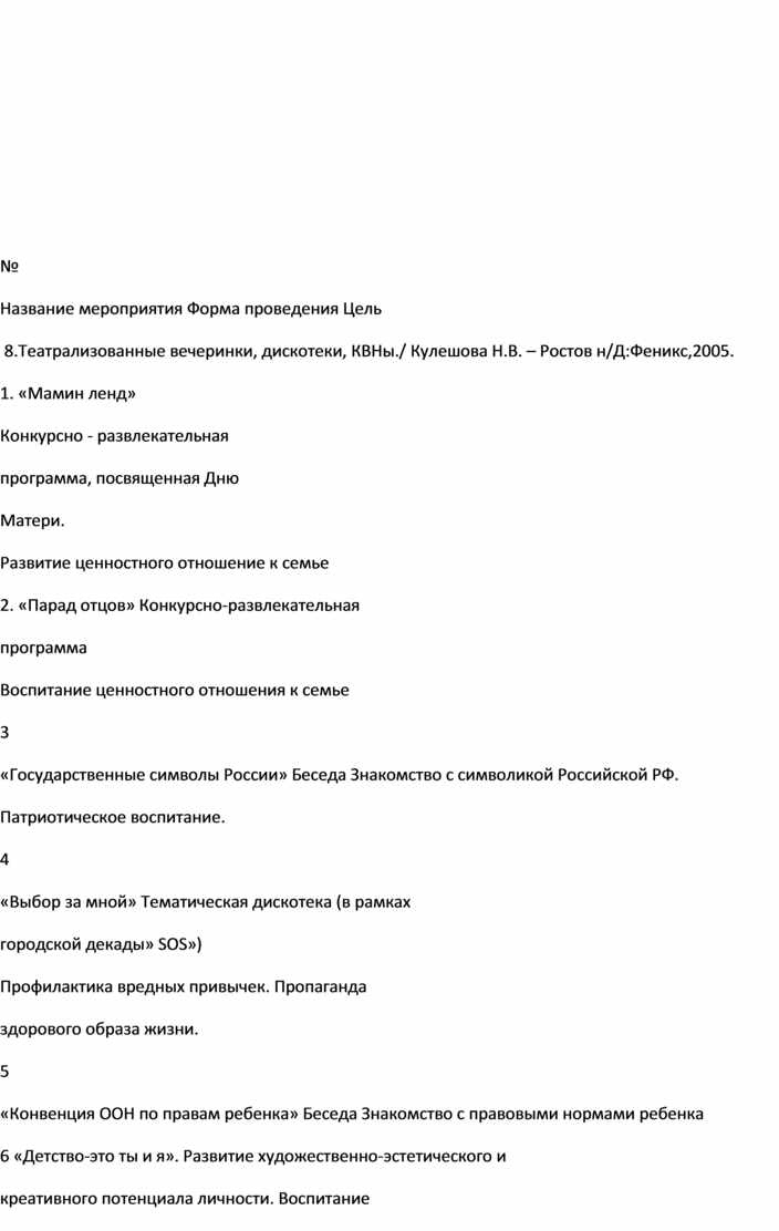 8.Театрализованные вечеринки, дискотеки, КВНы./ Кулешова Н.В. – Ростов н/Д:Феникс,2005.