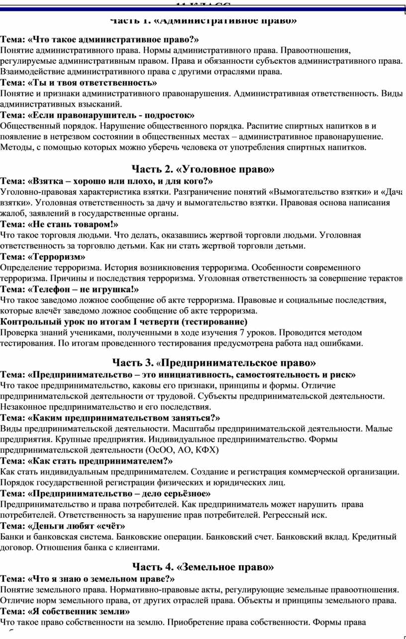 а) Правонарушение. б) Преступление. в) Наказание. г) Уголовная ответственность несовершеннолетних. д) Товарищ милиционер, вы не имеете права. е) Человек, устанавливающий истину. ж) Хулиганство. з) Осторожно! Наркотики! (ответственность за склонение к потреблению наркотических средств или психотропных веществ). и) Перед тем как…, подумай! к) Контрольный урок по итогам III четверти (тестирование). л) Встать! Суд идет! (подготовка к имитации судебного уголовного процесса). Часть 1. м) Встать! Суд идет! (имитация судебного уголовного процесса). Часть 2. н) Путешествие в зал судебных заседаний. |