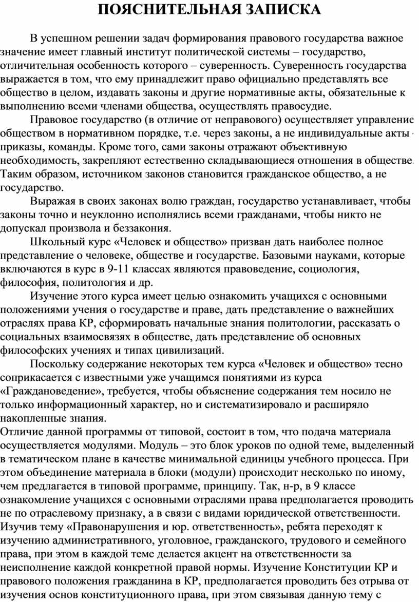 Отличие данной программы от типовой, состоит в том, что подача материала осуществляется модулями. Модуль – это блок уроков по одной теме, выделенный в тематическом плане в качестве минимальной единицы учебного процесса. При этом объединение материала в блоки (модули) происходит несколько по иному, чем предлагается в типовой программе, принципу. Так, н-р, в 9 классе ознакомление учащихся с основными отраслями права предполагается проводить не по отраслевому признаку, а в связи с видами юридической ответственности. Изучив тему «Правонарушения и юр. ответственность», ребята переходят к изучению административного, уголовное, гражданского, трудового и семейного права, при этом в каждой теме делается акцент на ответственности за неисполнение каждой конкретной правой нормы. Изучение Конституции КР и правового положения гражданина в КР, предполагается проводить без отрыва от изучения основ конституционного права, при этом связывая данную тему с понятием права как системы нормативных установок установленных государством.