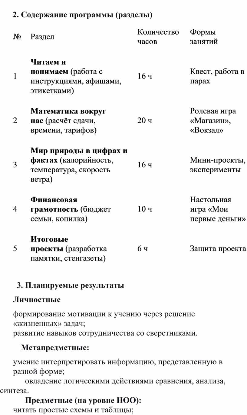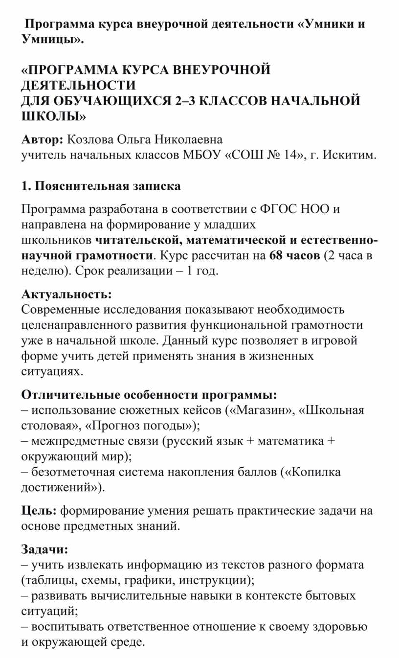Программа разработана в соответствии с ФГОС НОО и направлена на формирование у младших школьников читательской, математической и естественно-научной грамотности. Курс рассчитан на 68 часов (2 часа в неделю). Срок реализации – 1 год.
