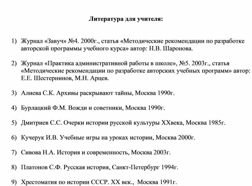 1) Журнал «Завуч» №4. 2000г., статья «Методические рекомендации по разработке авторской программы учебного курса» автор: Н.В. Шаронова.