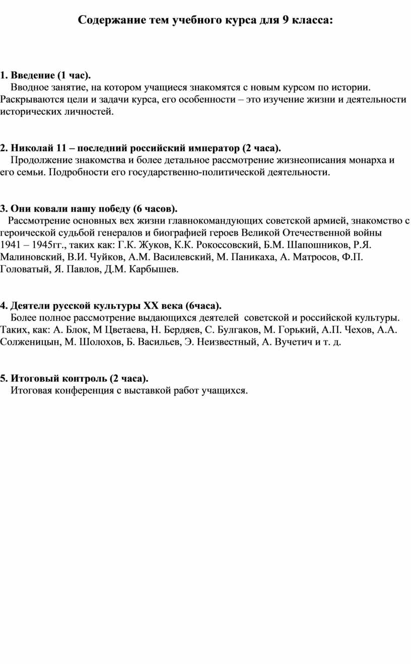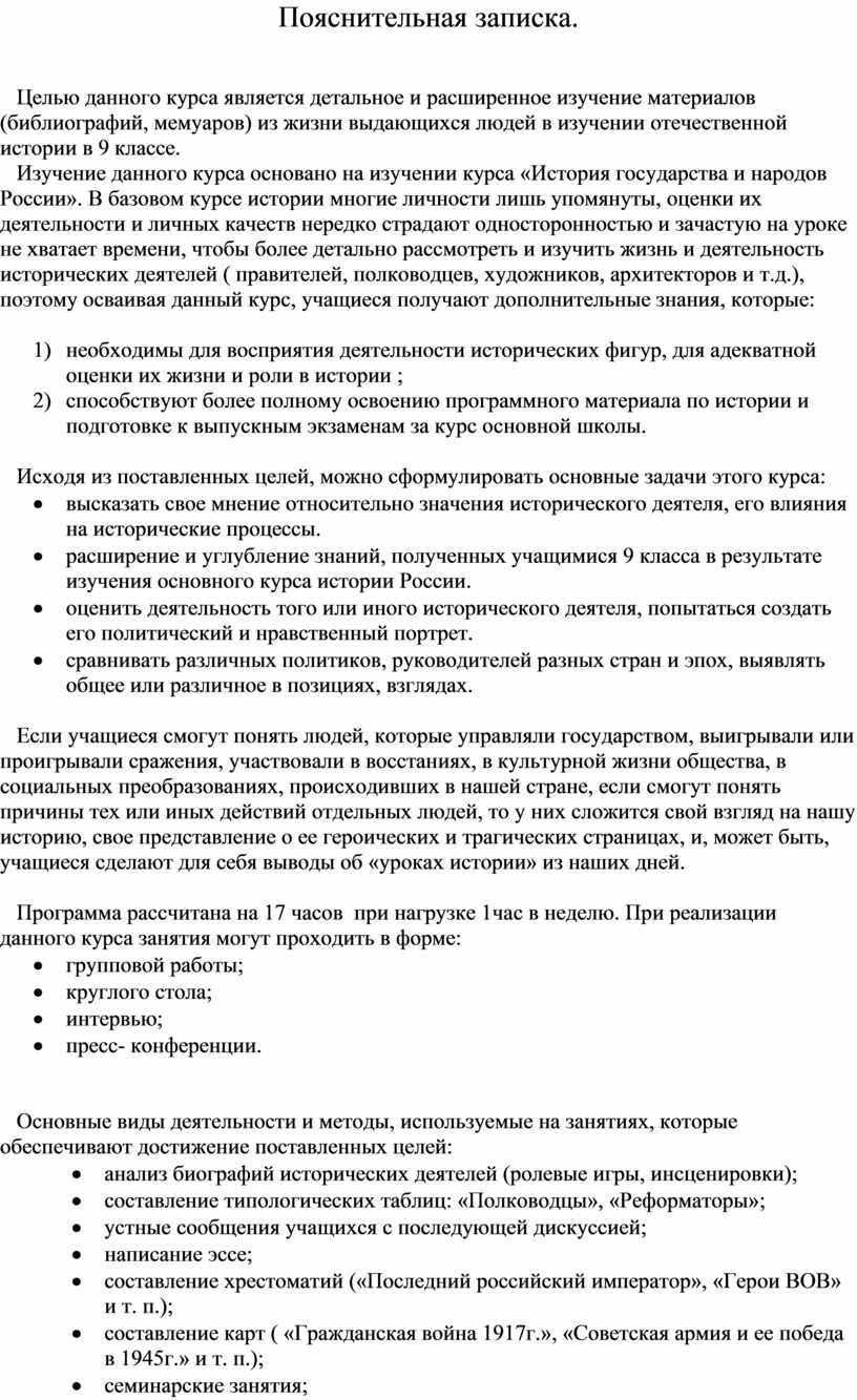 Целью данного курса является детальное и расширенное изучение материалов (библиографий, мемуаров) из жизни выдающихся людей в изучении отечественной истории в 9 классе.