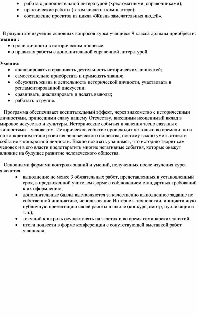 Изучение данного курса основано на изучении курса «История государства и народов России». В базовом курсе истории многие личности лишь упомянуты, оценки их деятельности и личных качеств нередко страдают односторонностью и зачастую на уроке не хватает времени, чтобы более детально рассмотреть и изучить жизнь и деятельность исторических деятелей ( правителей, полководцев, художников, архитекторов и т.д.), поэтому осваивая данный курс, учащиеся получают дополнительные знания, которые: