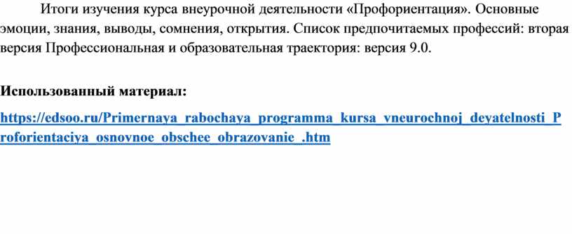 Итоги изучения курса внеурочной деятельности «Профориентация». Основные эмоции, знания, выводы, сомнения, открытия. Список предпочитаемых профессий: вторая версия Профессиональная и образовательная траектория: версия 9.0.