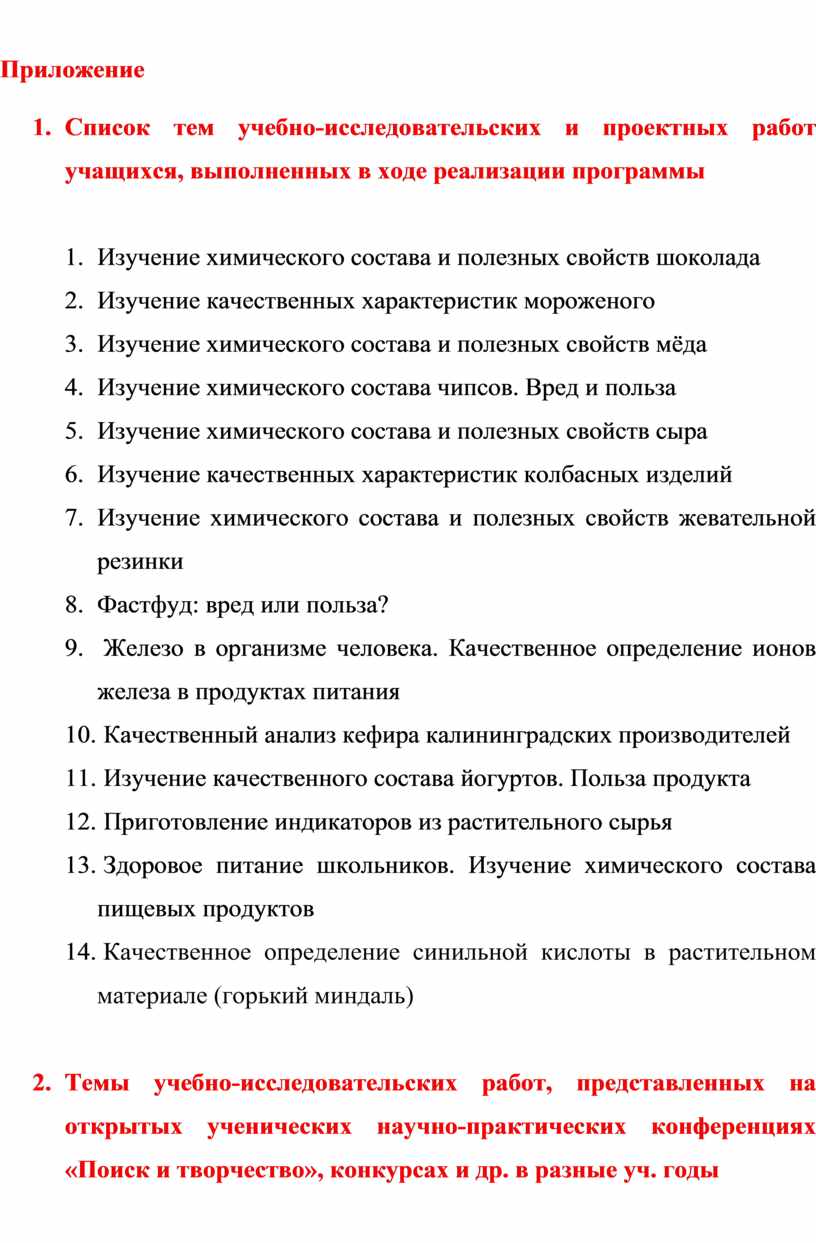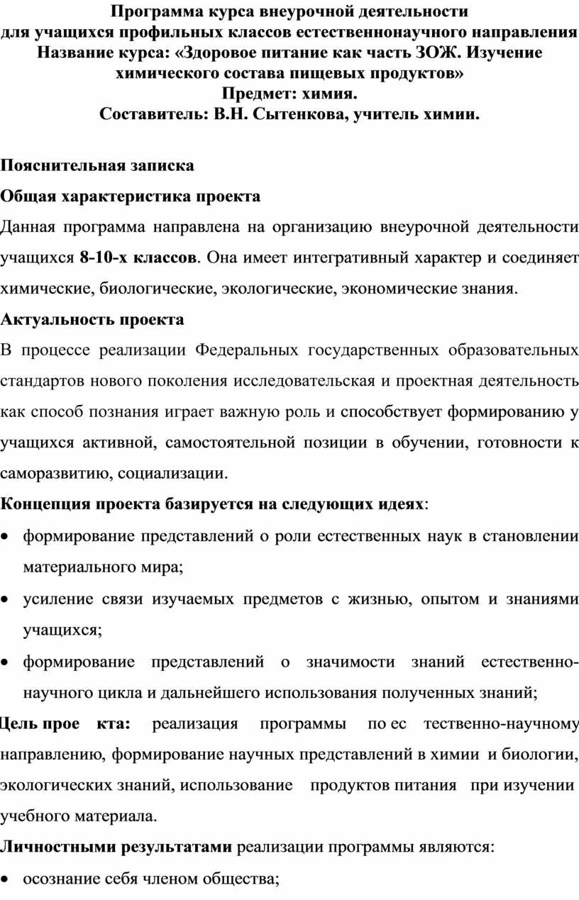 Данная программа по организации внеурочной деятельности учащихся профильных классов является обобщением многолетней работы учителя в рамках организации учебно-исследовательской деятельности учеников и работы профильных дней. В ходе реализации данной программы были использованы ресурсы гимназической столовой, библиотеки и школьной химической лаборатории.