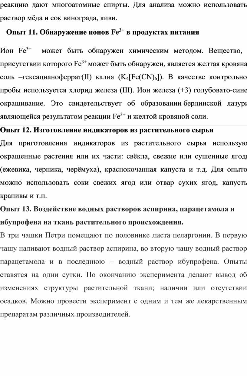 Опыт 13. Воздействие водных растворов аспирина, парацетамола и ибупрофена на ткань растительного происхождения.