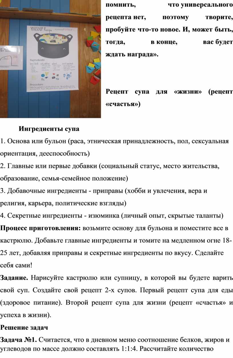 Задание. Нарисуйте кастрюлю или супницу, в которой вы будете варить свой суп. Создайте свой рецепт 2-х супов. Первый рецепт супа для еды (здоровое питание). Второй рецепт супа для жизни (рецепт «счастья» и успеха в жизни).