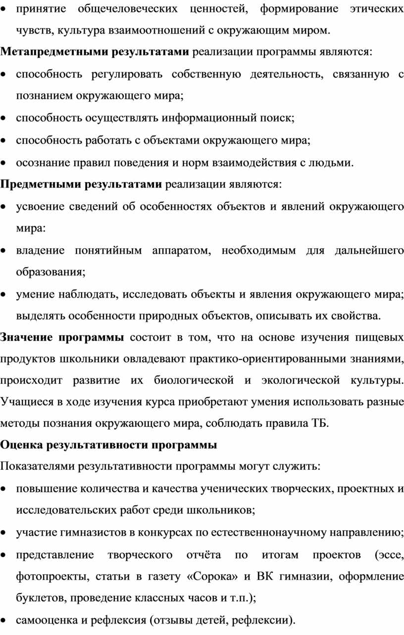 Значение программы состоит в том, что на основе изучения пищевых продуктов школьники овладевают практико-ориентированными знаниями, происходит развитие их биологической и экологической культуры. Учащиеся в ходе изучения курса приобретают умения использовать разные методы познания окружающего мира, соблюдать правила ТБ.