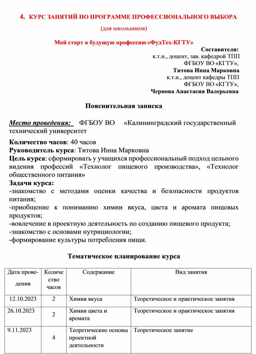 5. Курс занятий по программе профессионального выбора