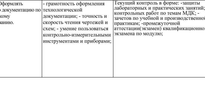 - грамотность оформления технологической документации; - точность и скорость чтения чертежей и схем; - умение пользоваться контрольно-измерительными инструментами и приборами; |