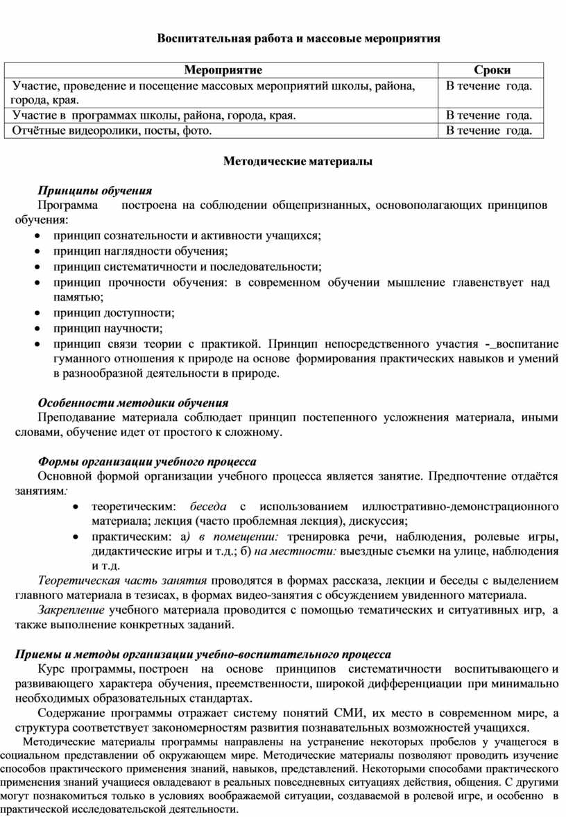Особенностью программы является то, что в процессе ее освоения, учащиеся получат начальные знания и умения смежных профессий: режиссер, фото- и видеооператор, монтажер, ведущий, радиоведущий. Особое значение имеет практическая составляющая занятий. Учащиеся, опираясь на интуицию, предлагают варианты решений поставленных педагогом задач, педагог анализирует и комментирует ответ, отмечая плюсы и исправляя минусы, подкрепляя видеопримерами. Затем учащиеся реализуют придуманный план (съемка). После этого происходит просмотр и разбор материала с последующим обсуждением. Удачные кадры затем будут смонтированы. Такой подход позволит стать автором видеопроизведения в первую очередь учащимся, второстепенно – педагогу. Такой практический опыт дает максимальную эффективность в освоении базы. Понимая свои способности и заинтересованность, учащиеся смогут определиться с ролями и в последствие углубить свои знания по конкретному направлению.