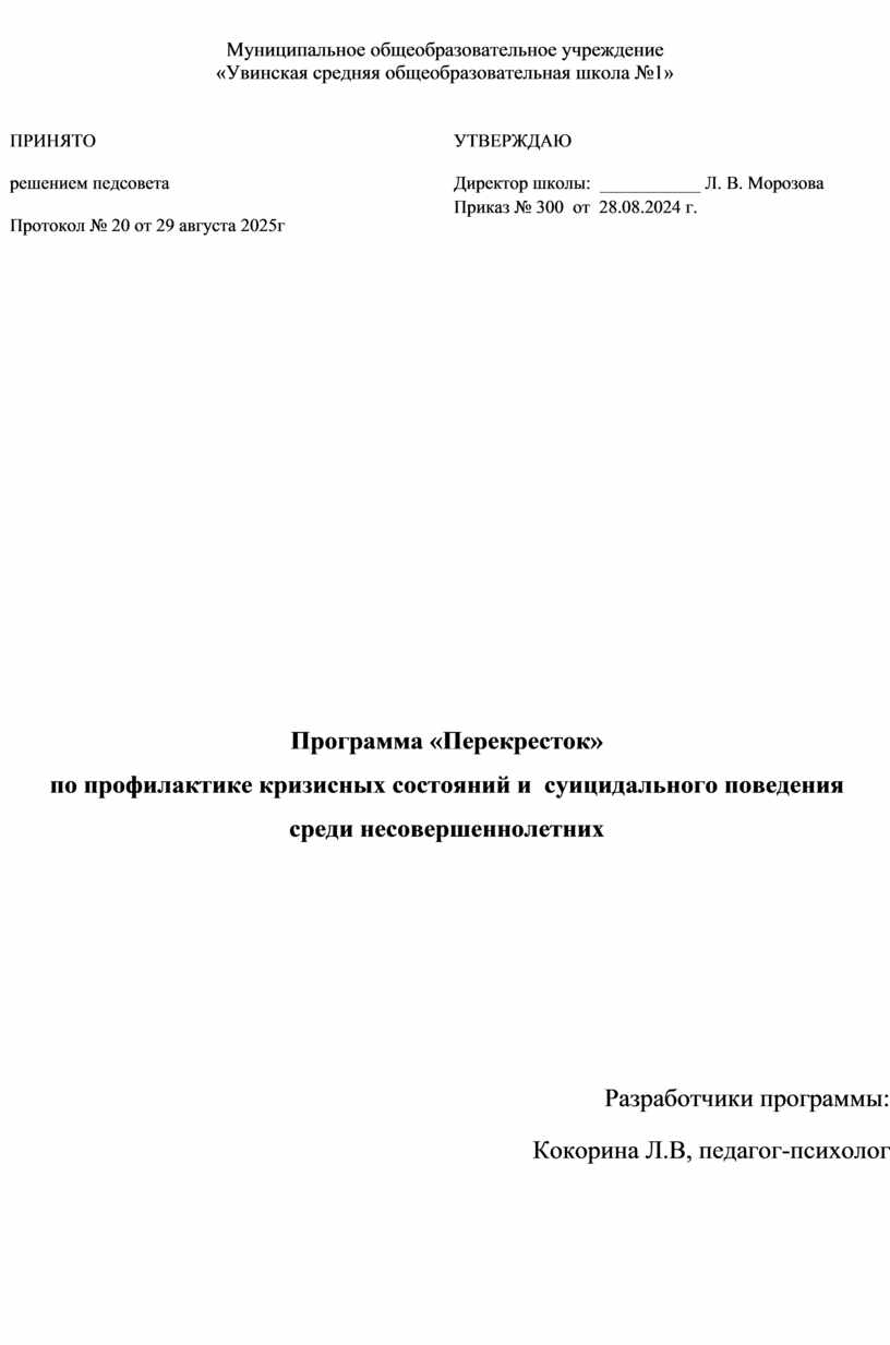 УТВЕРЖДАЮ Директор школы: ___________ Л. В. Морозова Приказ № 300 от 28.08.2024 г.