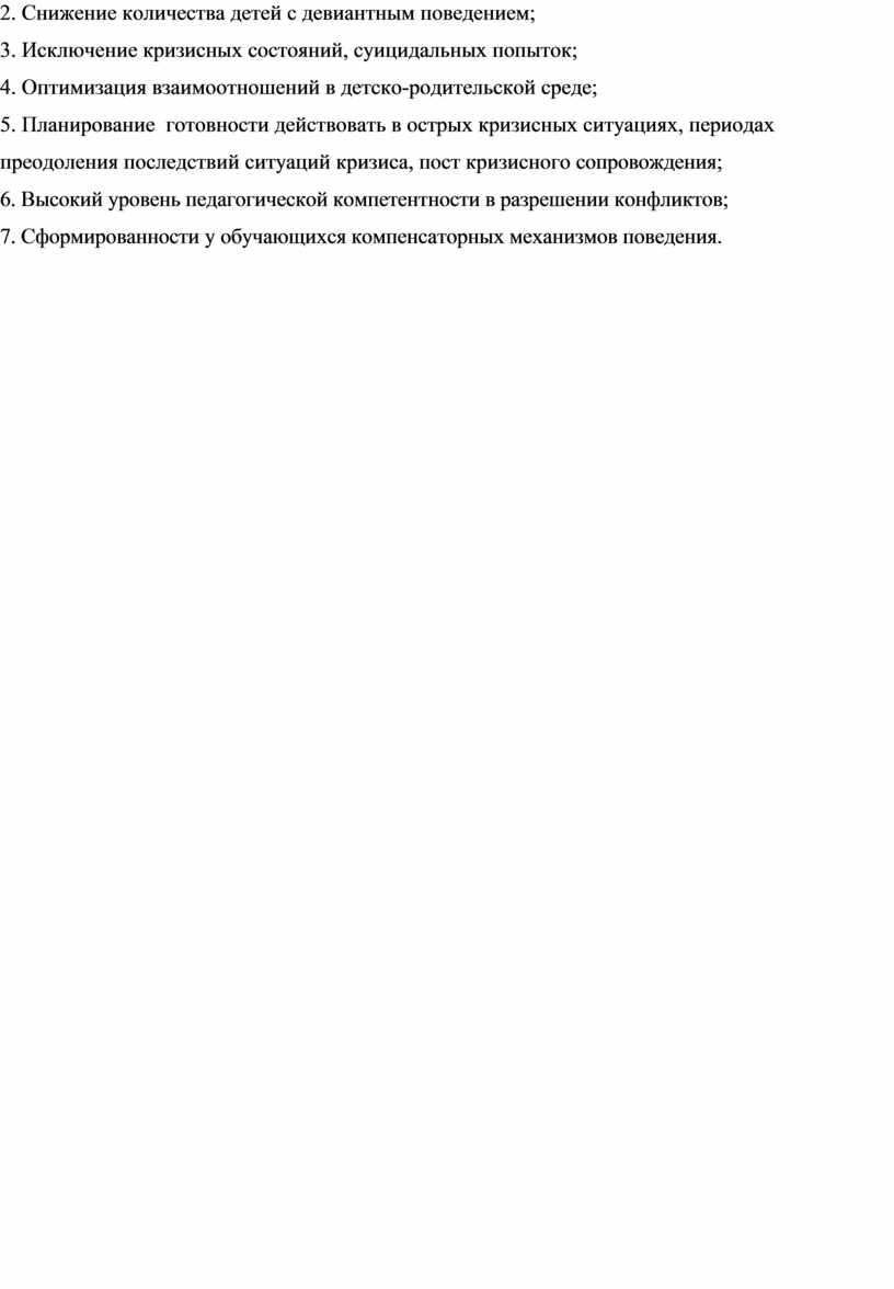 1. Осуществление социальной и психологической защиты детей; 2. Снижение количества детей с девиантным поведением; 3. Исключение кризисных состояний, суицидальных попыток; 4. Оптимизация взаимоотношений в детско-родительской среде; 5. Планирование готовности действовать в острых кризисных ситуациях, периодах преодоления последствий ситуаций кризиса, посткризисного сопровождения; 6. Высокий уровень педагогической компетентности в разрешении конфликтов; 7. Сформированность у обучающихся компенсаторных механизмов поведения. |