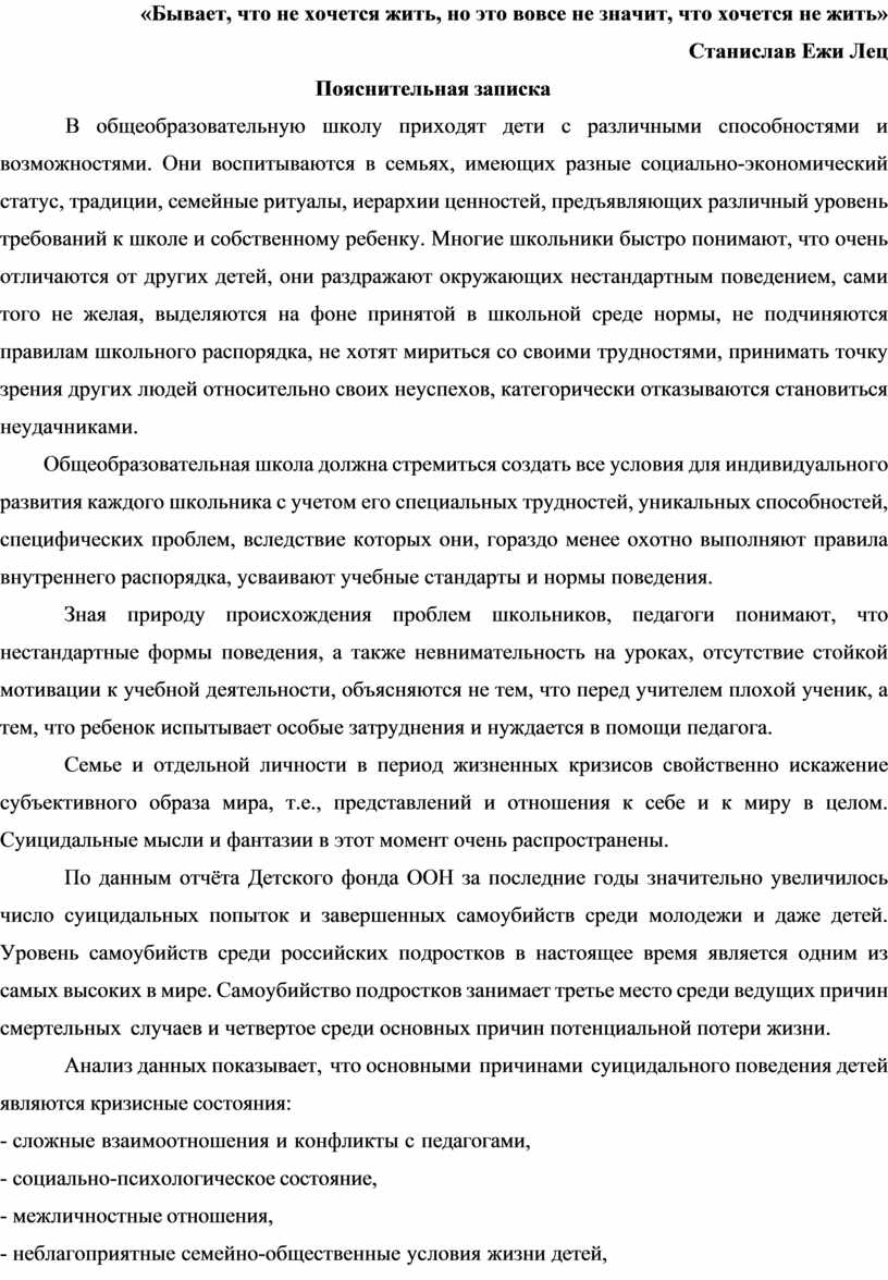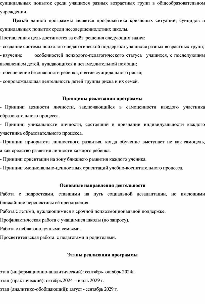 Данная программа предназначена для организации профилактической и коррекционной работы всех участников образовательного процесса по предотвращению кризисных ситуаций, суицидальных попыток среди учащихся разных возрастных групп в общеобразовательном учреждении.