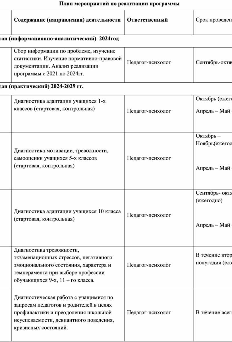 1.этап (информационно-аналитический): сентябрь - октябрь 2024г. 2.этап (практический): октябрь 2024 – июль 2029 г. 3. 3.этап (аналитико-обобщающий): август - сентябрь 2029 г.
