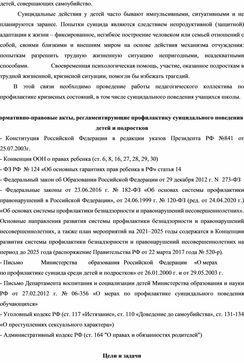 - Конституция Российской Федерации в редакции указов Президента РФ №841 от 25.07.2003г. - Конвенция ООН о правах ребенка (ст. 6, 8, 16, 27, 28, 29, 30) - ФЗ РФ № 124 «Об основных гарантиях прав ребенка в РФ» статья 14 - Федеральный закон об Образовании Российской Федерации от 29 декабря 2012 г. N 273-ФЗ - Федеральные законы от 23.06.2016 г. № 182-ФЗ «Об основах системы профилактики правонарушений в Российской Федерации», от 24.06.1999 г. № 120-ФЗ (ред. от 24.04.2020 г.) «Об основах системы профилактики безнадзорности и правонарушений несовершеннолетних». Основные направления развития системы профилактики безнадзорности и правонарушений несовершеннолетних, а также план мероприятий на 2021–2025 годы содержатся в Концепции развития системы профилактики безнадзорности и правонарушений несовершеннолетних на период до 2025 года (распоряжение Правительства РФ от 22 марта 2017 года № 520-р). - Письмо Министерства образования Российской Федерации «О мерах по профилактике суицида среди детей и подростков» от 26.01.2000 г. и от 29.05.2003 г. - Письмо Департамента воспитания и социализации детей Министерства образования и науки РФ от 27.02.2012 г. № 06-356 «О мерах по профилактике суицидального поведения обучающихся» - Уголовный кодекс РФ (ст. 117 «Истязание», ст. 110 «Доведение до самоубийства», ст. 131-134 «О преступлениях сексуального характера») - Административный кодекс РФ (ст. 164 "О правах и обязанностях родителей") |