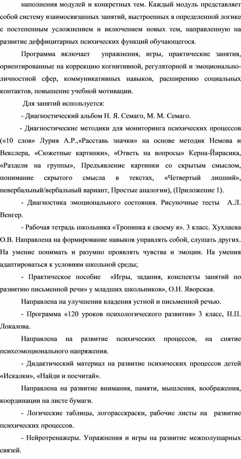 Программа включает упражнения, игры, практические занятия, ориентированные на коррекцию когнитивной, регуляторной и эмоционально-личностной сфер, коммуникативных навыков, расширению социальных контактов, повышение учебной мотивации.