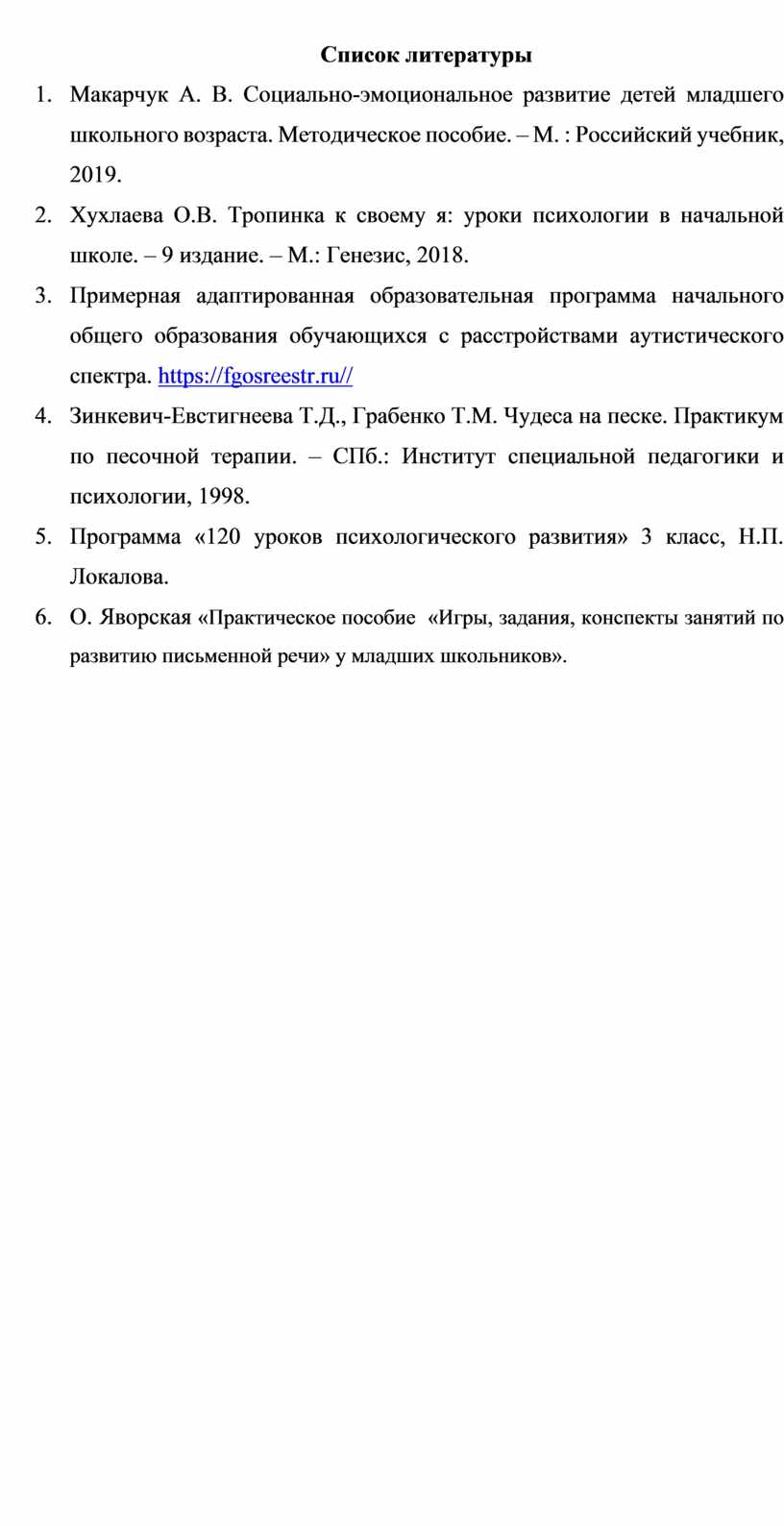 1. Макарчук А. В. Социально-эмоциональное развитие детей младшего школьного возраста. Методическое пособие. – М. : Российский учебник, 2019.