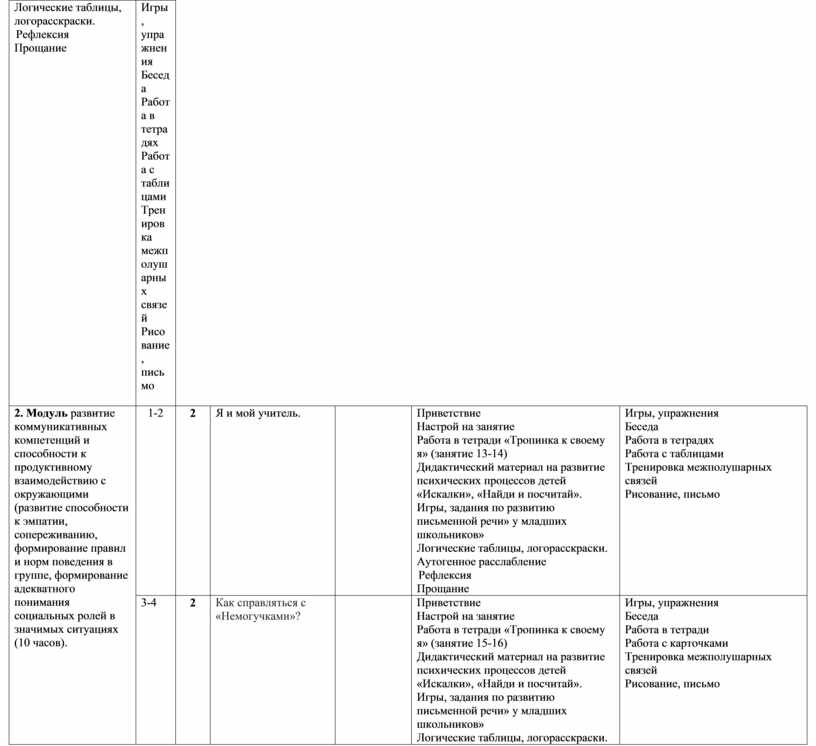 2. Модуль развитие коммуникативных компетенций и способности к продуктивному взаимодействию с окружающими (развитие способности к эмпатии, сопереживанию, формирование правил и норм поведения в группе, формирование адекватного понимания социальных ролей в значимых ситуациях (10 часов). |