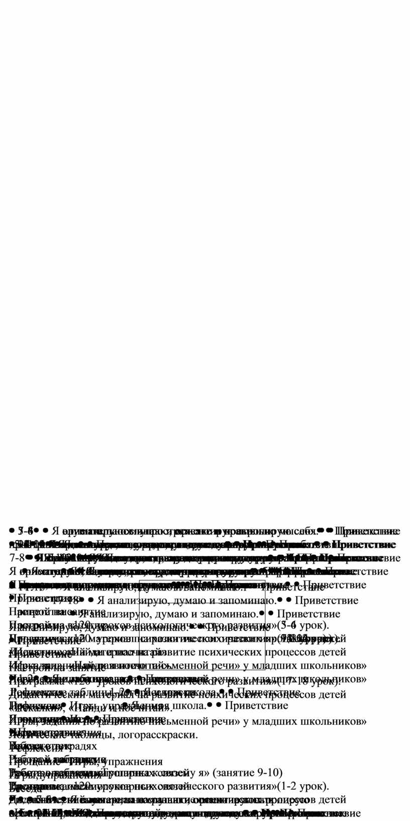 Приветствие Настрой на занятие Программа «120 уроков психологического развития»(23-24 урок). Дидактический материал на развитие психических процессов детей «Искалки», «Найди и посчитай». Игры, задания по развитию письменной речи» у младших школьников» Логические таблицы, логорасскраски. Рефлексия Прощание |