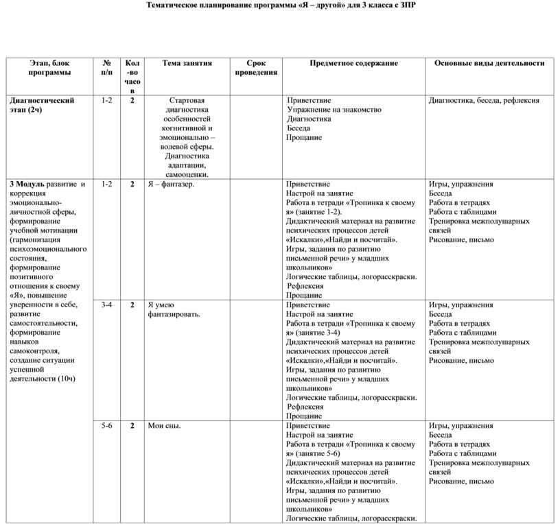 Тематическое планирование программы «Я – другой» для 3 класса с ЗПР