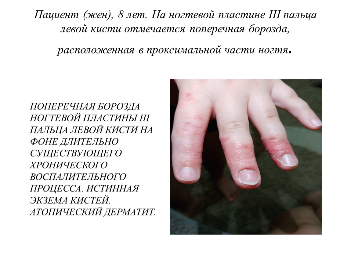 ПОПЕРЕЧНАЯ БОРОЗДА НОГТЕВОЙ ПЛАСТИНЫ III ПАЛЬЦА ЛЕВОЙ КИСТИ НА ФОНЕ ДЛИТЕЛЬНО СУЩЕСТВУЮЩЕГО ХРОНИЧЕСКОГО ВОСПАЛИТЕЛЬНОГО ПРОЦЕССА. ИСТИННАЯ ЭКЗЕМА КИСТЕЙ. АТОПИЧЕСКИЙ ДЕРМАТИТ.